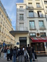 L’heure du pique-nique sonne. Nous traversons la Seine, passons devant le Louvre et nous arrêtons dans le somptueux jardin tout en fleurs du Palais-Royal. Après cette pause bien méritée, notre professeure nous présente les galeries, leurs arcades et leurs secrets. Galerie de Valois, nous trouvons l’emplacement de la boutique où Charlotte Corday a acheté le couteau pour assassiner Marat. Galerie de Montpensier, à côté du théâtre du Palais-Royal, l’immeuble où vivaient Jean Cocteau et Jean Marais puis juste derrière, celui où résidait celle qu’on appelait « La dame du Palais-Royal », l’écrivaine Colette.